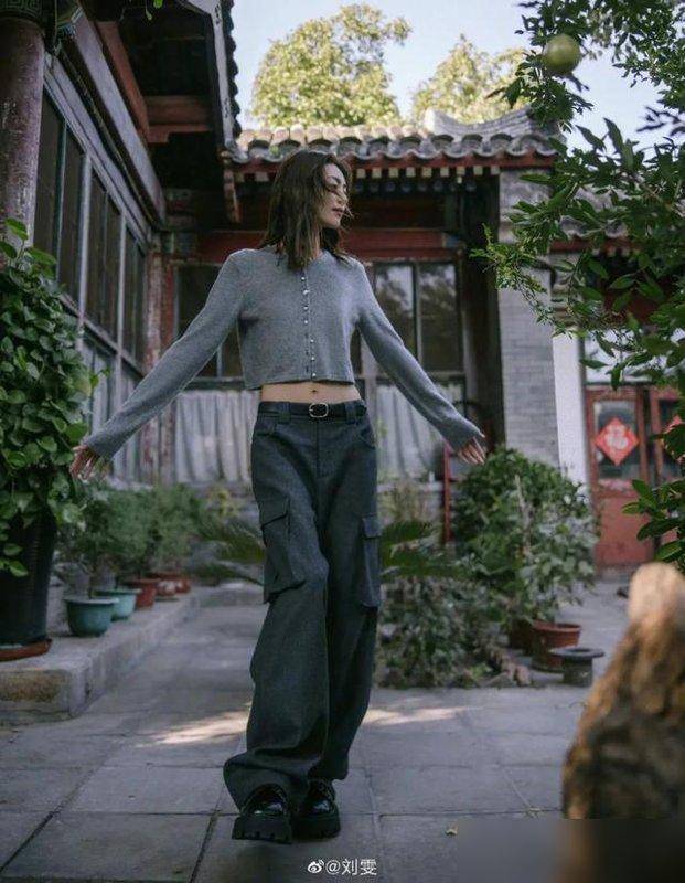 对了,搭配宽腿裤还有个“隐藏法则”:上衣一定要“收”。宽腿裤已经占了下半身的“体积”,上衣再穿oversize,整个人就像个“长方形”——短款针织衫、修身打底衫或者crop top一搭,腰露出来了,腿也显长了。你看周雨彤配皮革夹克时,内搭是短款,是不是瞬间“腿长一米八”?刘雯搭运动款时,上衣选修身款,是不是把“运动感”改成了“利落感”?