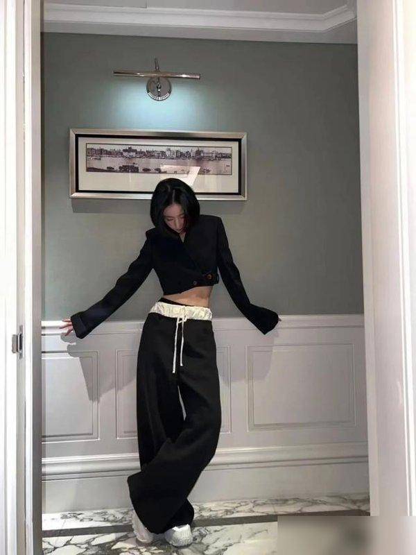 刘雯穿的那种运动款宽腿裤,拼接个硬挺的腰封,把腰线上提两公分,运动感里带点时装精的讲究,早上赶地铁穿也不邋遢;周雨彤更会玩,用西装面料拼松紧腰,本来西装料偏正式,加了松紧腰就软下来,配个短款皮革夹克,飒爽里带点随性,是不是比穿牛仔裤配羽绒服有质感?